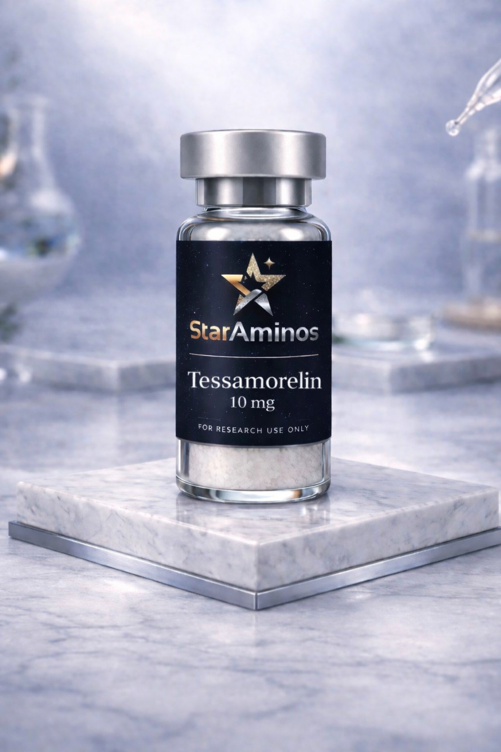 Tesamorelin is a synthetic peptide studied for its role in growth hormone-related and metabolic research.